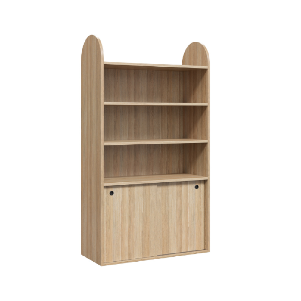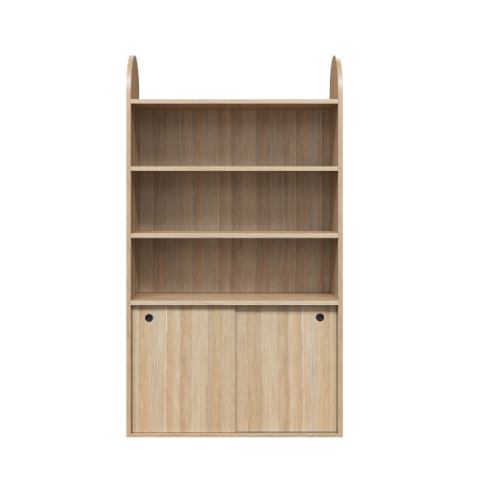 Mabry is a set of curved end cupboards designed for wall storage, combining both style and functionality. Connected by an acoustic panel and the possibility of adding LED lighting, it presents itself as a sophisticated choice for any professional breakout area.